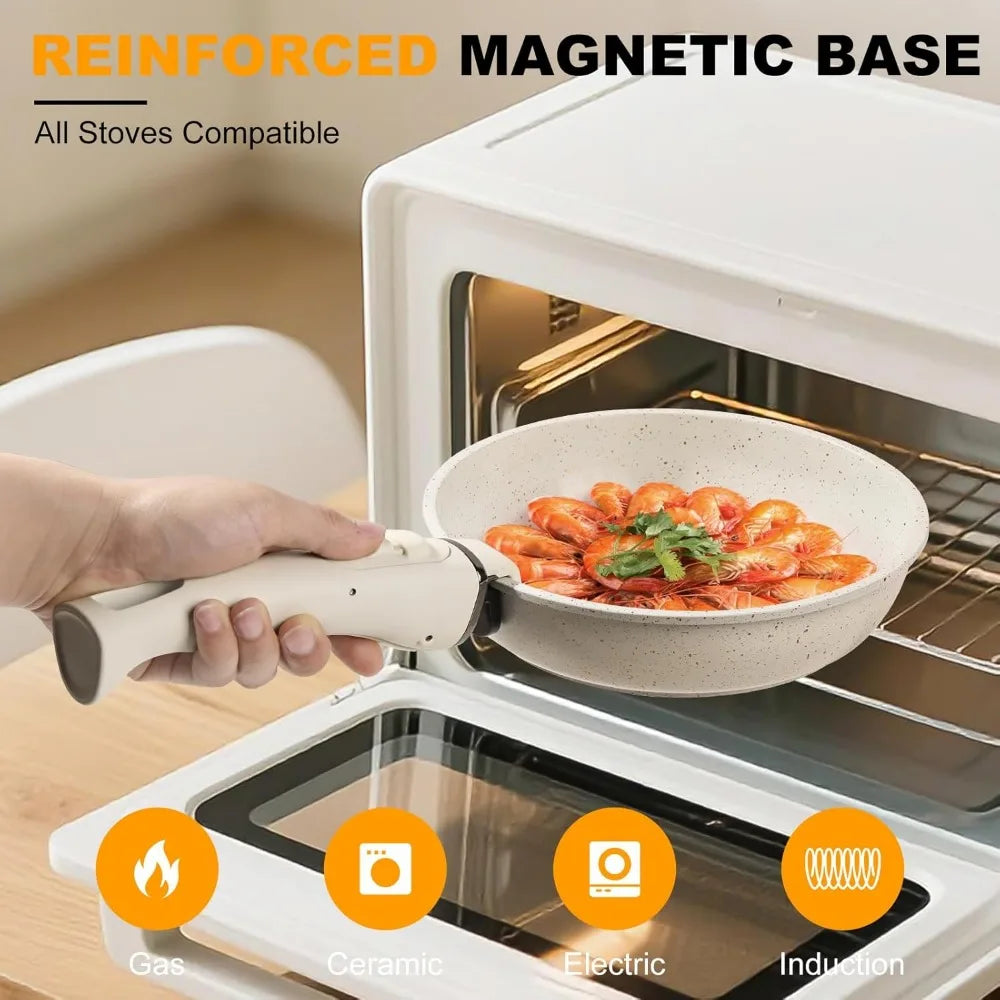 - 【Universal Detachable Handle】The Quick-Release handle enables seamless transitions between cooking surfaces - effortlessly shift from induction stovetops to ovens (up to 842°F), grills, refrigerators, or direct table serving. This multi-surface compatibility unlocks unprecedented culinary flexibility.