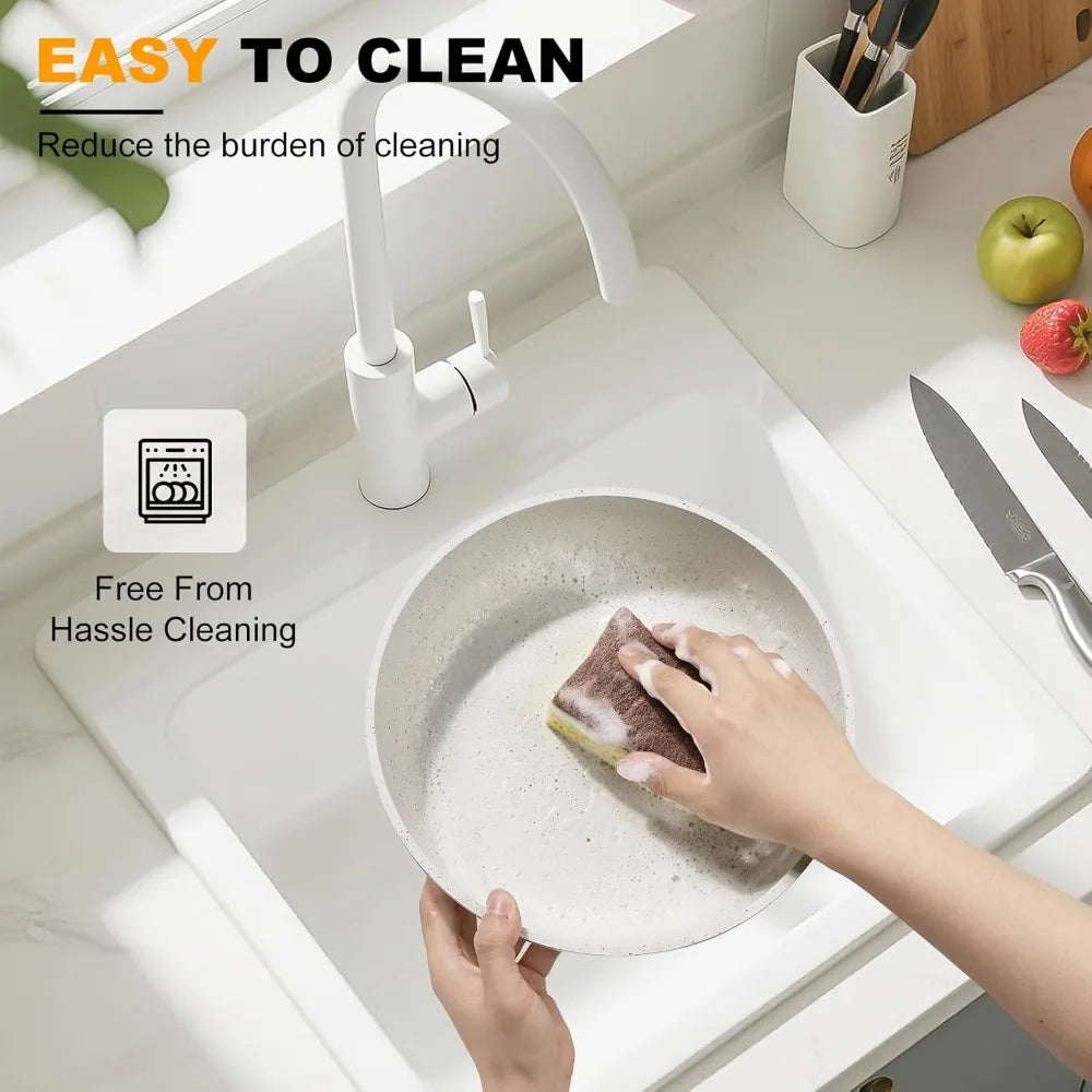 - 【360° Natural Ceramic Protection】 dual-sided ceramic coating pants and pots set eliminates Teflon/PFAS toxins while resisting scratches 2X better than standard pans. Naturally non-reactive and fingerprint-proof, it ensures safe cooking with effortless cleanup.