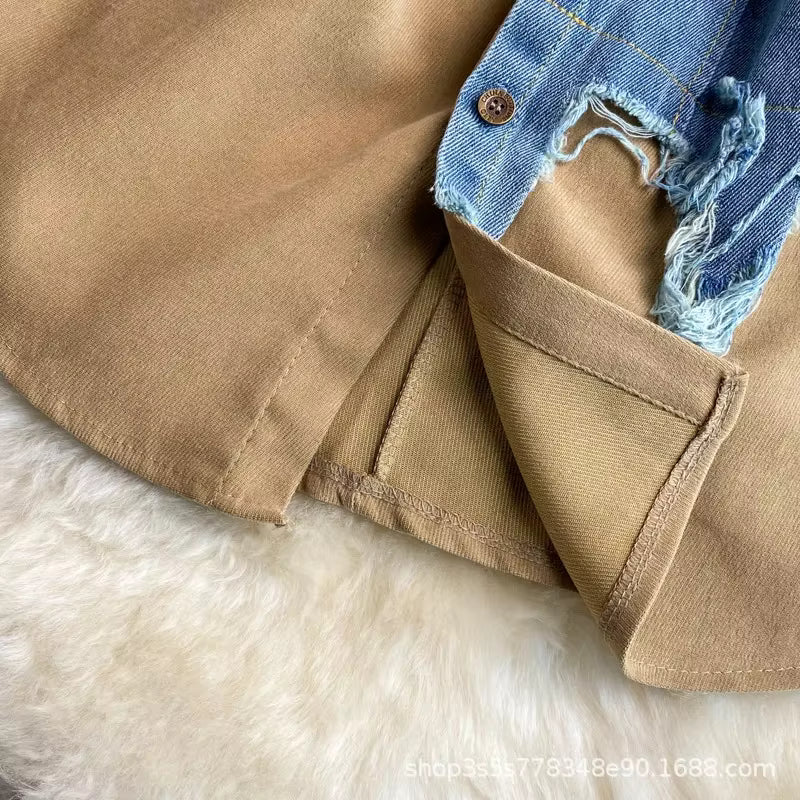 Slimming Denim Patchwork Lapel Tunic Autumn Waist-fitted Medium-length Shirt